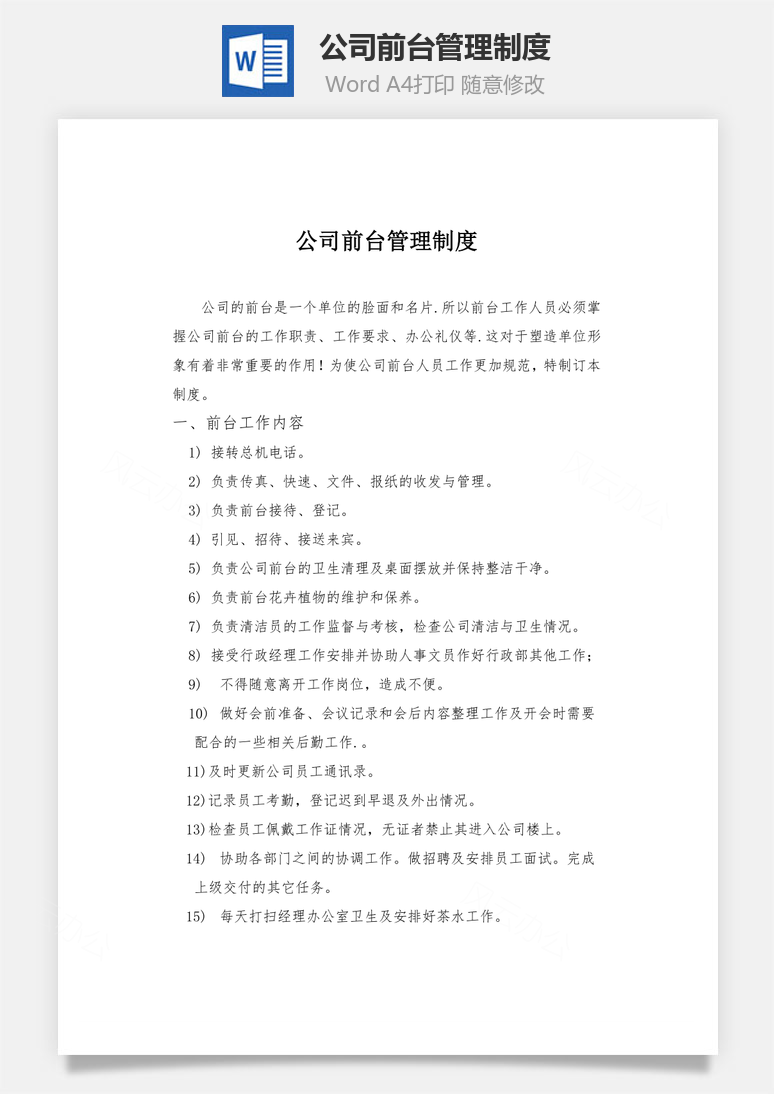 本模板为公司前台管理制度Word文档,文字图片可以直接替换,使用简单方便